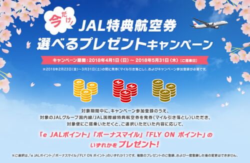 JALがかなり特殊なキャンペーンを開始します。 特典航空券にてJAL便に乗るとeJALポイント or マイル or FLY ON ポイントがプレゼントされるというモノです。 通常のキャンペーンに比べて何がユニークかというと、やはり「FLY ON ポイント」が追加で貰えると…
