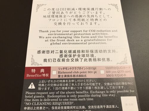 ビジネスホテルのひとつであるリッチモンドホテルに宿泊する際には、必要が無ければ清掃不要を申告しておくと、素敵なプレゼントがあります。 それはリッチモンドクラブポイント800ptかクオカード500円分のいずれかです。 清掃不要の申告1回につきリッチモン…